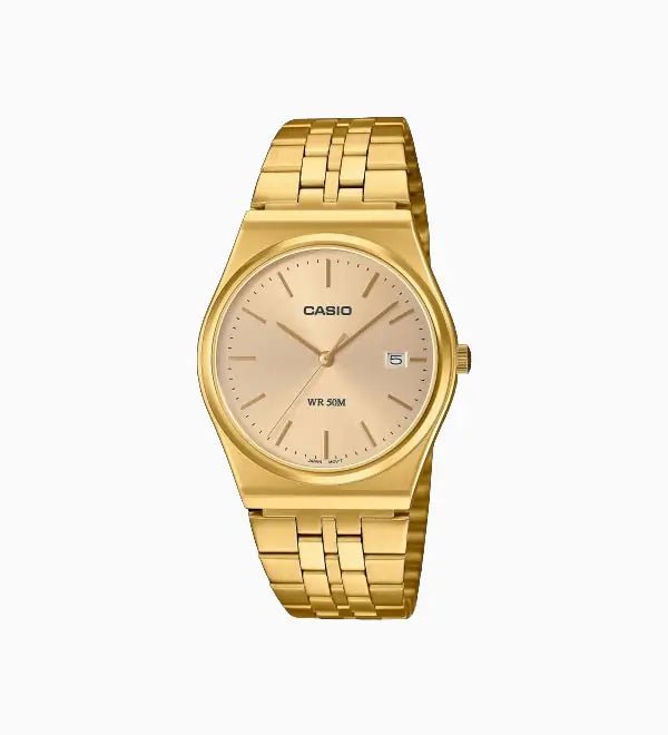 - Exterior Glass Mineral Glass Surface treatment Gold ion plated case Gold ion plated band Compatible band size 150 to 205 mm