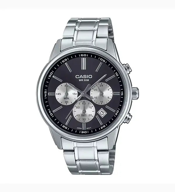 Analog: 3 hands (hour, minute, second), 3 dials (24-hour, stopwatch minutes, stopwatch seconds)